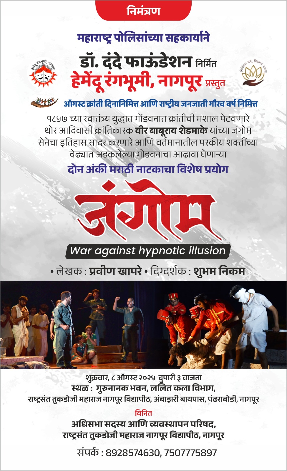 नागपुर । एड अब्दुल अमानी कुरेशी । महाराष्ट्र पुलिस के सहयोग से तथा डॉ. दंदे फाउंडेशन द्वारा निर्मित और हेमेंदु रंगभूमि, नागपुर द्वारा प्रस्तुत अगस्त क्रांति दिवस पर एवं राष्ट्रीय आदिवासी गौरव वर्ष के अवसर पर दो आंकी मराठी नाटक "जंगोम"की प्रस्तुति की जाएंगी।